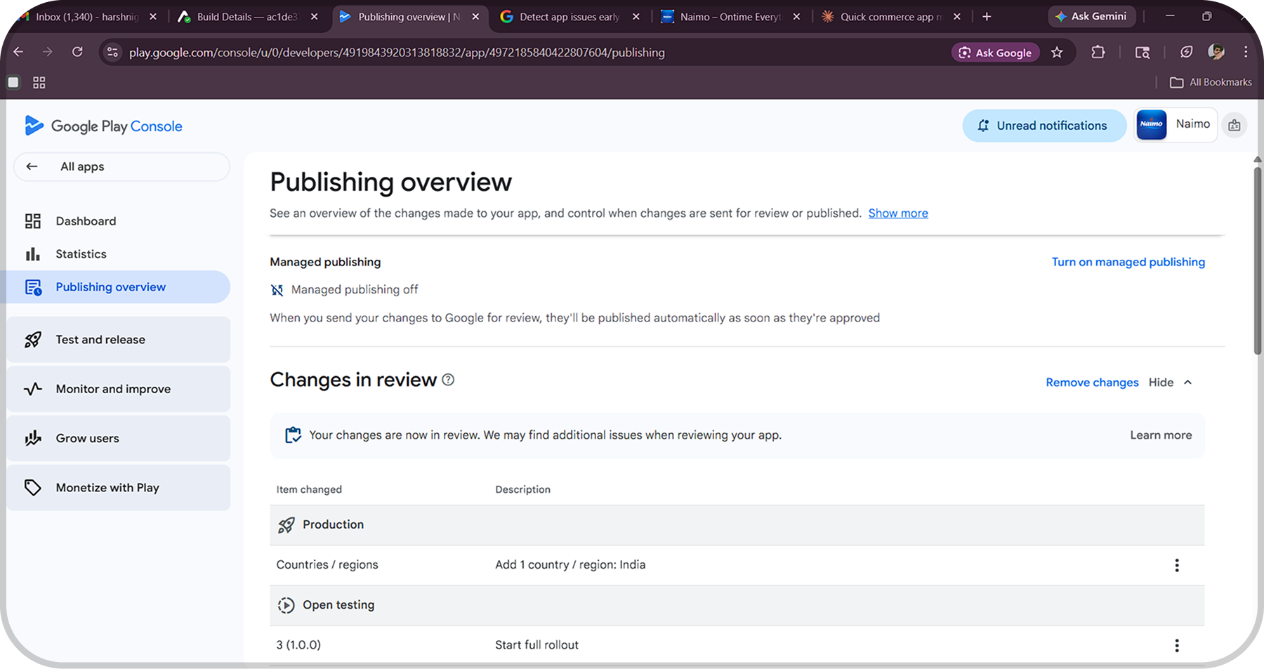 Managed end-to-end app deployment through Google Play Console, including build uploads, release management, testing workflows, and publishing Naimo to the Google Play Store.